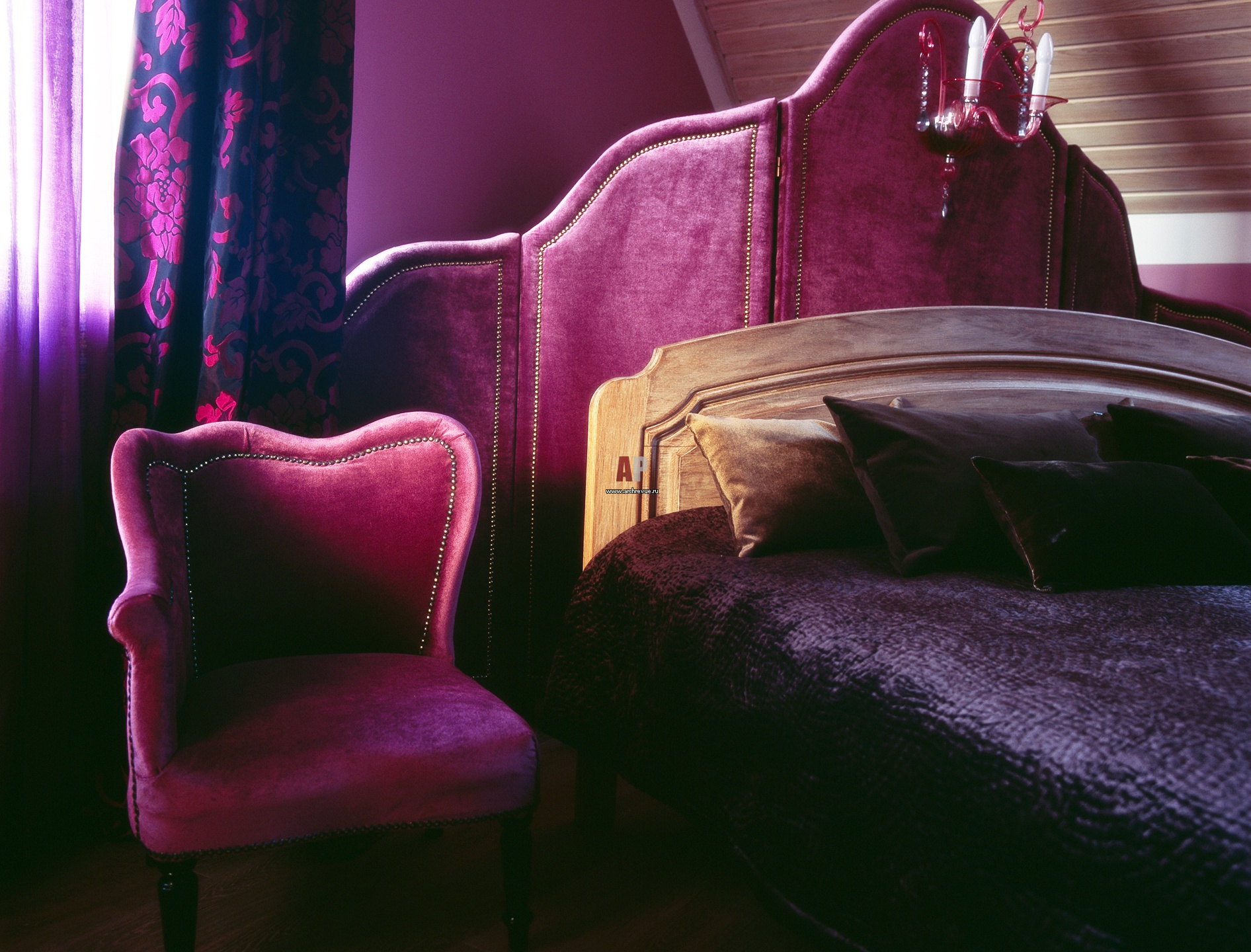 Кровать в главной спальне хозяйка привезла из своего старого дома. Реставраторы лишь поработали со спинкой, придав дереву седой оттенок. Оригинальная ширма выполнена на заказ в поддержку к двум антикварным стульям, обитым сиреневым бархатом.