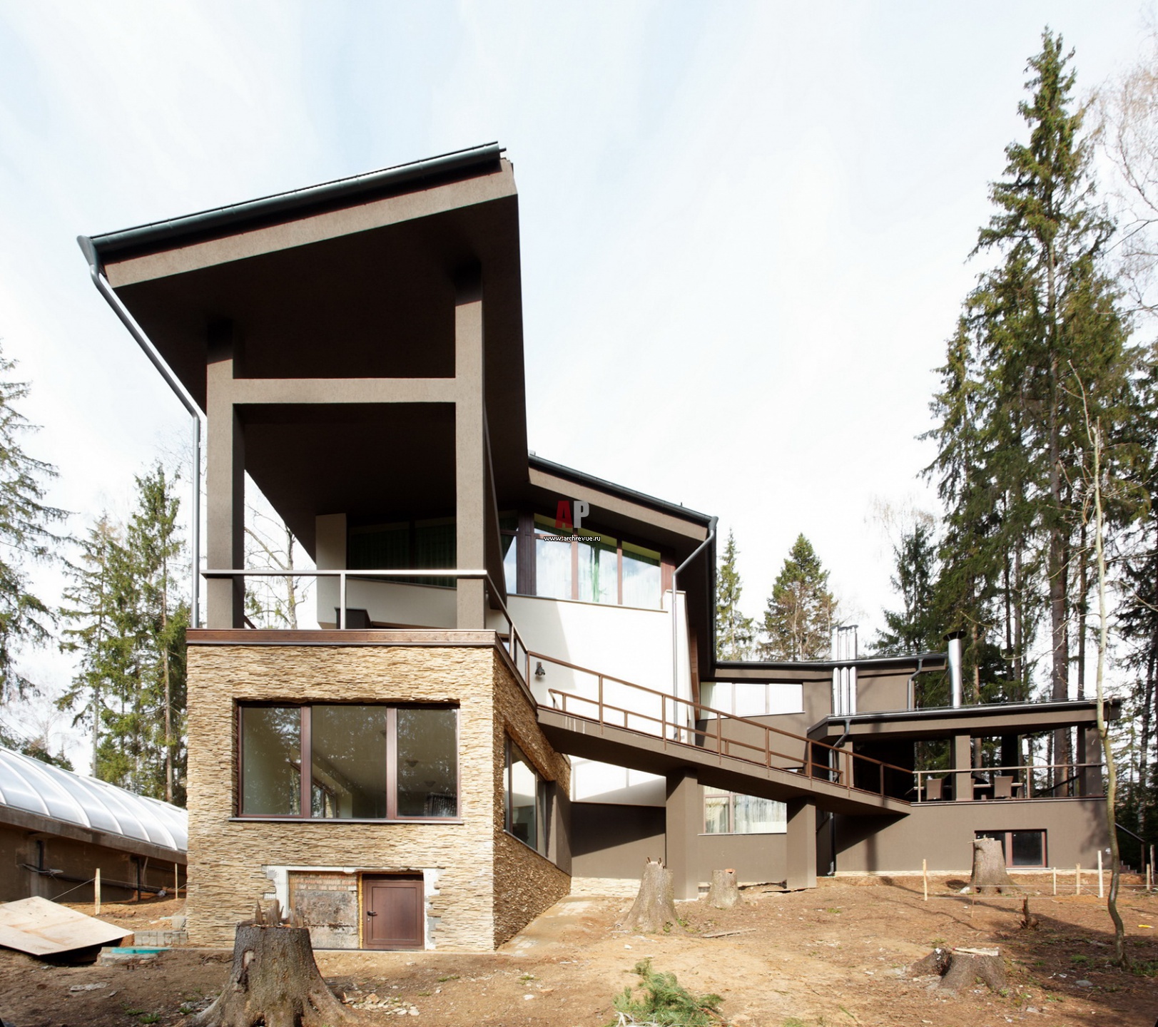 Фасад дома в современном стиле. Цоколь облицован диким камнем.