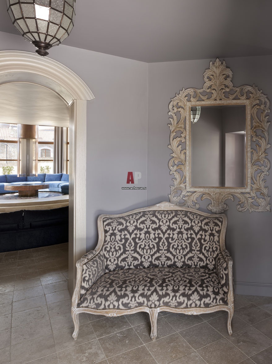 Фото интерьера входной зоны дома в стиле фьюжн. Кушетка, зеркало в стиле необарокко.