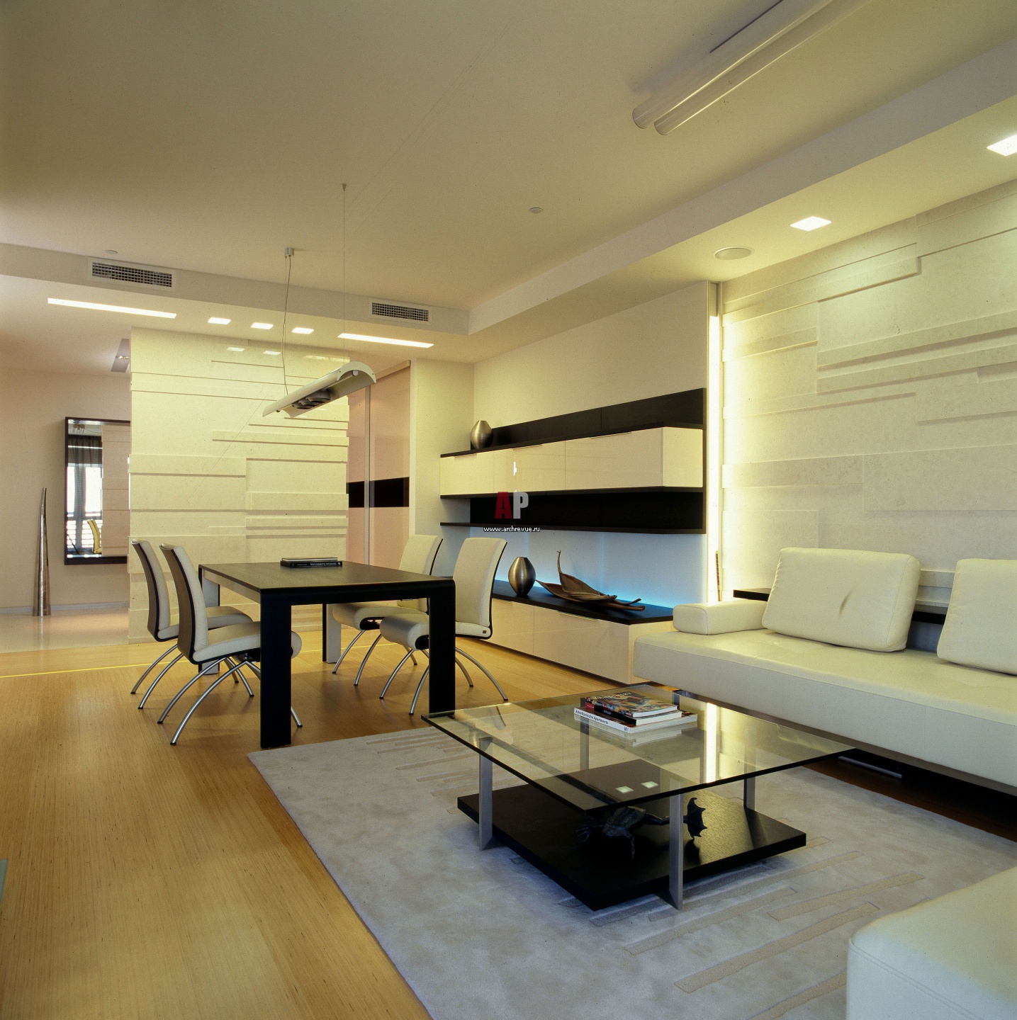 Фото интерьера гостиной. Часть стен с общественной части квартиры выложена мраморными плитами. Микс из глянцевых и матовых плит, а также их укладка на разных по глубине уровнях создают иллюзию цельных каменных глыб и шире – природного горного склона.