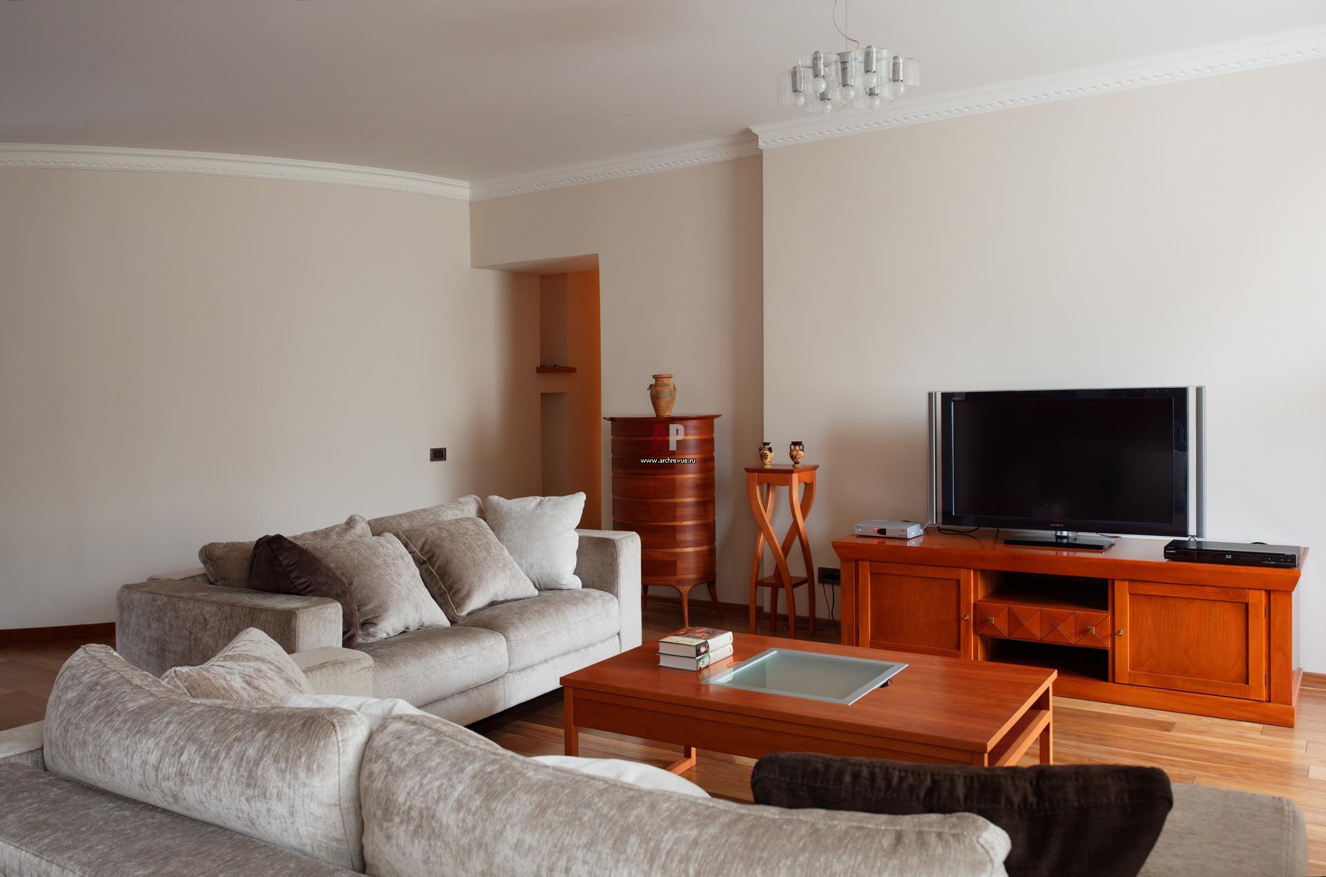 Диванная группа от фабрики Desiree в оформлении гостиной. Стены декорированы однотонной краской пастельного цвета, сложная геометрия подчеркнута с помощью тонкого лепного карниза и деревянных плинтусов.