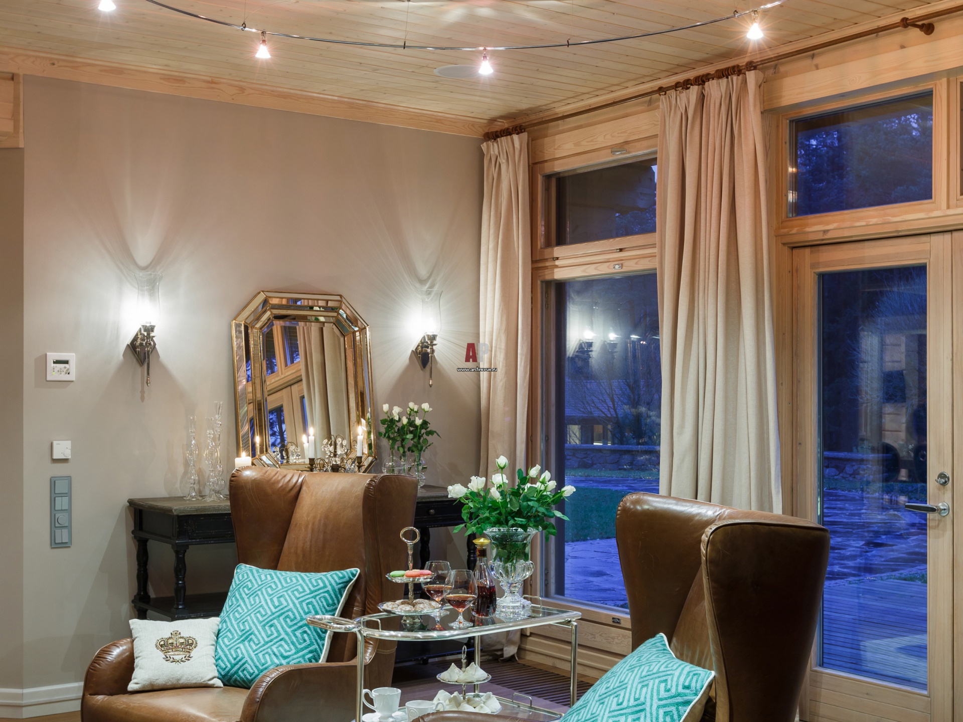 На фото – дизайн интерьера зоны отдыха в каминной строится на выигрышном сочетании темно-коричневой кожи и бирюзового текстиля. Высоту помещения нисколько не занижает плоский металлический радиусный светильник на тросах.