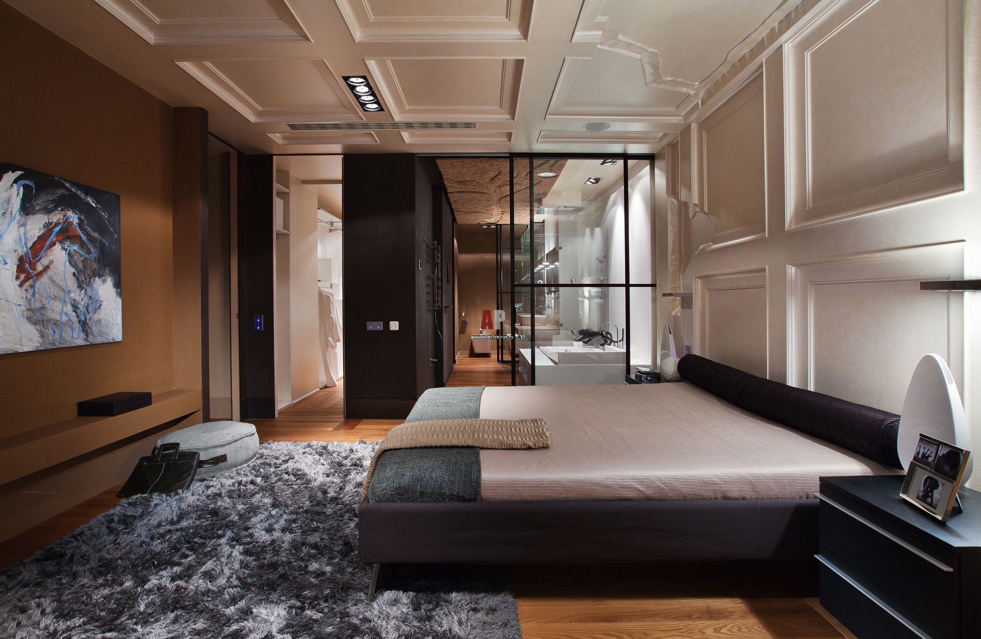 Фото интерьера современной спальни. Уютная комната оформлена в теплой бежево-песочной цветовой гамме. За раздвижными перегородками из прозрачного стекла в раме из темного дерева находится ванная комната с душевой.