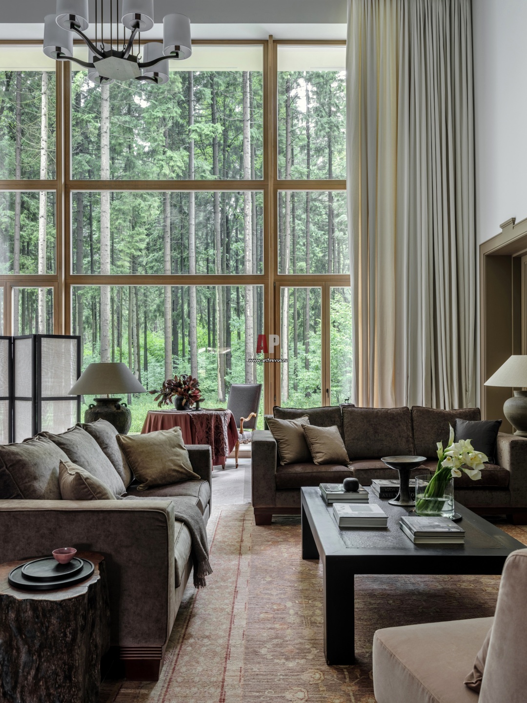 Интерьер трехэтажного дома с антиквариатом. В гостиной использована мягкая мебель с бархатными обивками плотных темных оттенков. На полу – паркет из дуба под маслом.
