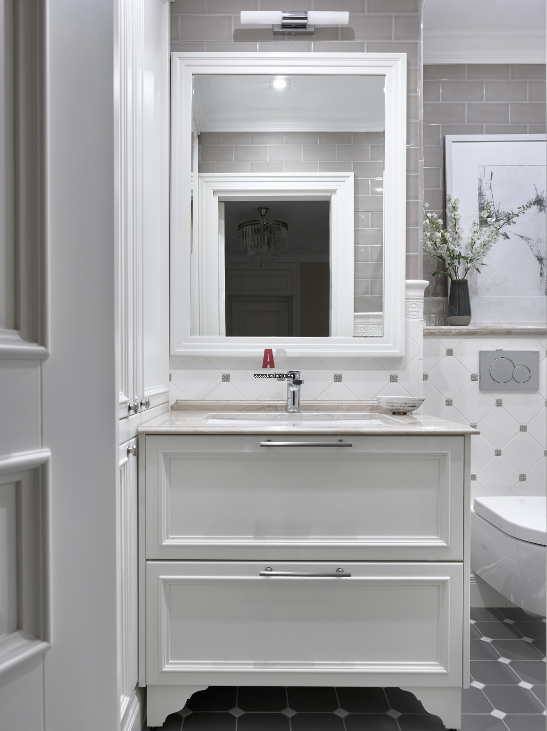 Гостевой санузел. На пооу и стенах – керамическая плитка, Adex. Умывальник, дерево, белая эмаль, на заказ. Столешница – натуральный мрамор. Раковина и унитаз, Villeroy & Boch. Смесители, Hansgrohe.