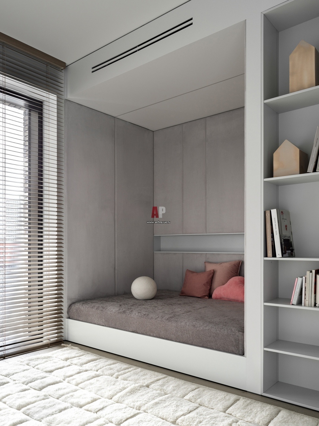 Нежная детская для девочки с розово-персиковыми акцентами. Кровать со встроенным стеллажом вынесены в ниши. Зона кровати со всех сторон отделана мягкими панелями и наполнена декоративными подушками, что позволяет ей выполнять функцию глубокого дивана.