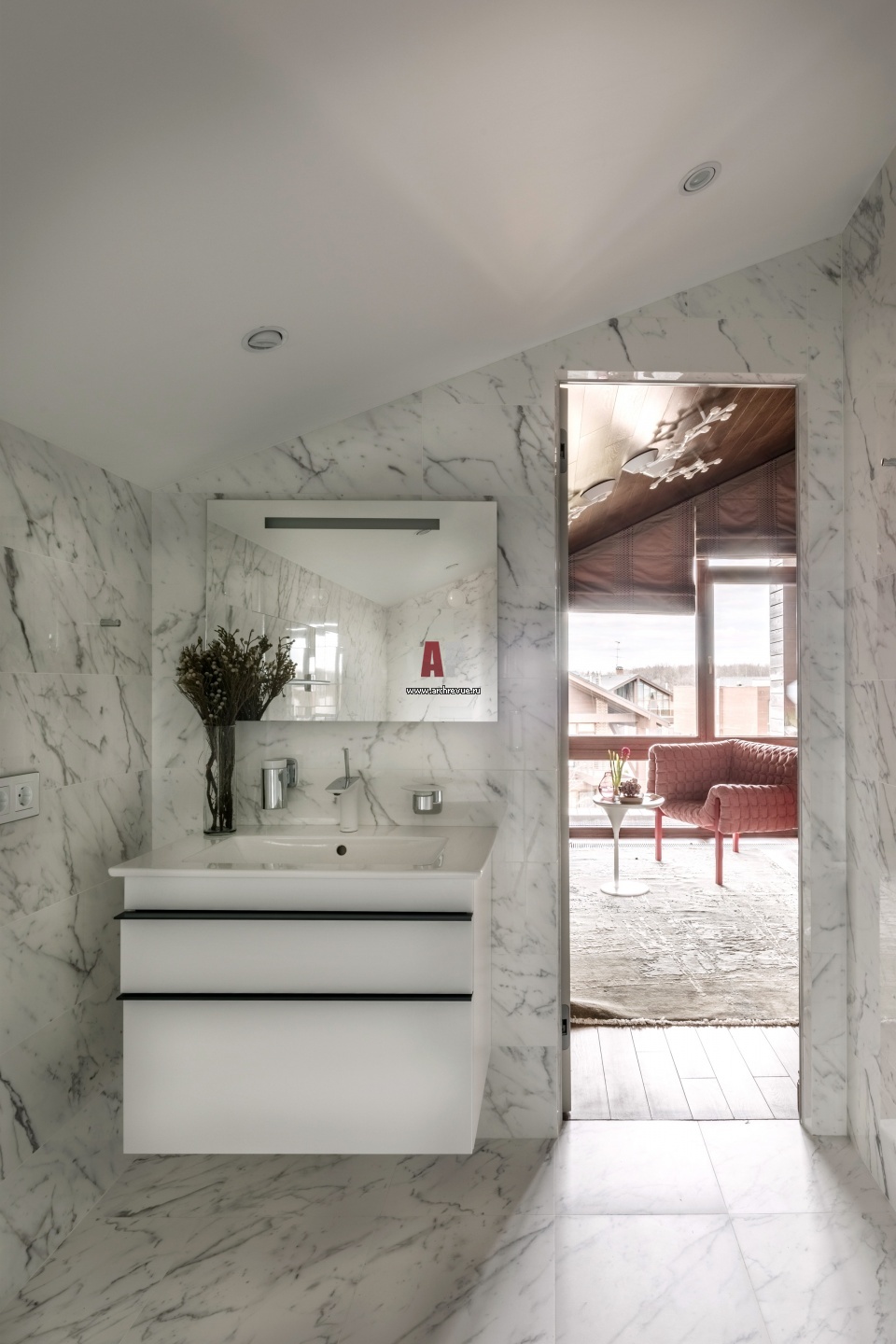 Ванная комната в мансарде облицована аскетичным белым камнем, он зрительно увеличивает небольшое помещение со скошенным потолком. Сантехника, Villeroy & Boch.