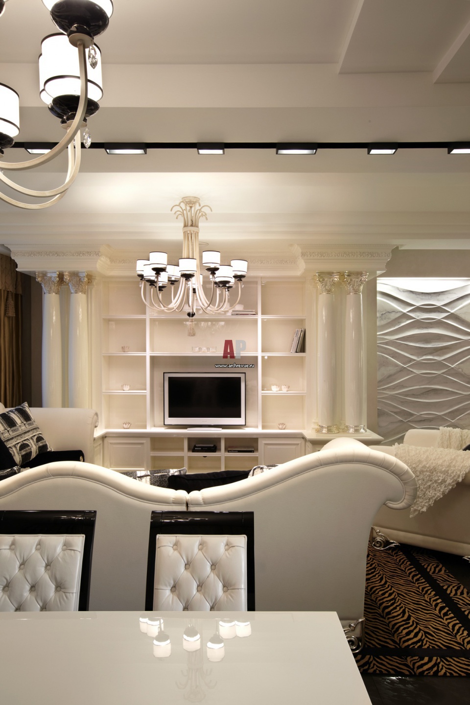Зона ТВ в гостиной обрамлена коринфскими колоннами. Сами колонны заполированы до блеска, а лепной декор покрыт серебром. Лепнина, поставщик «Петергоф».