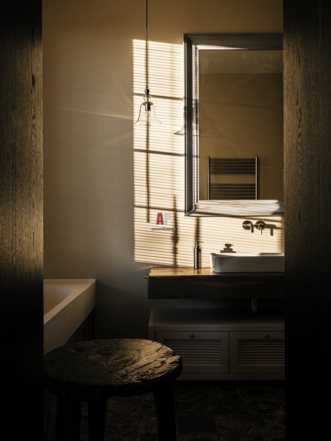 Небольшая дача в Истринском районе Подмосковья. Ванная комната. Фактура необработанного дерева украшает интерьер.