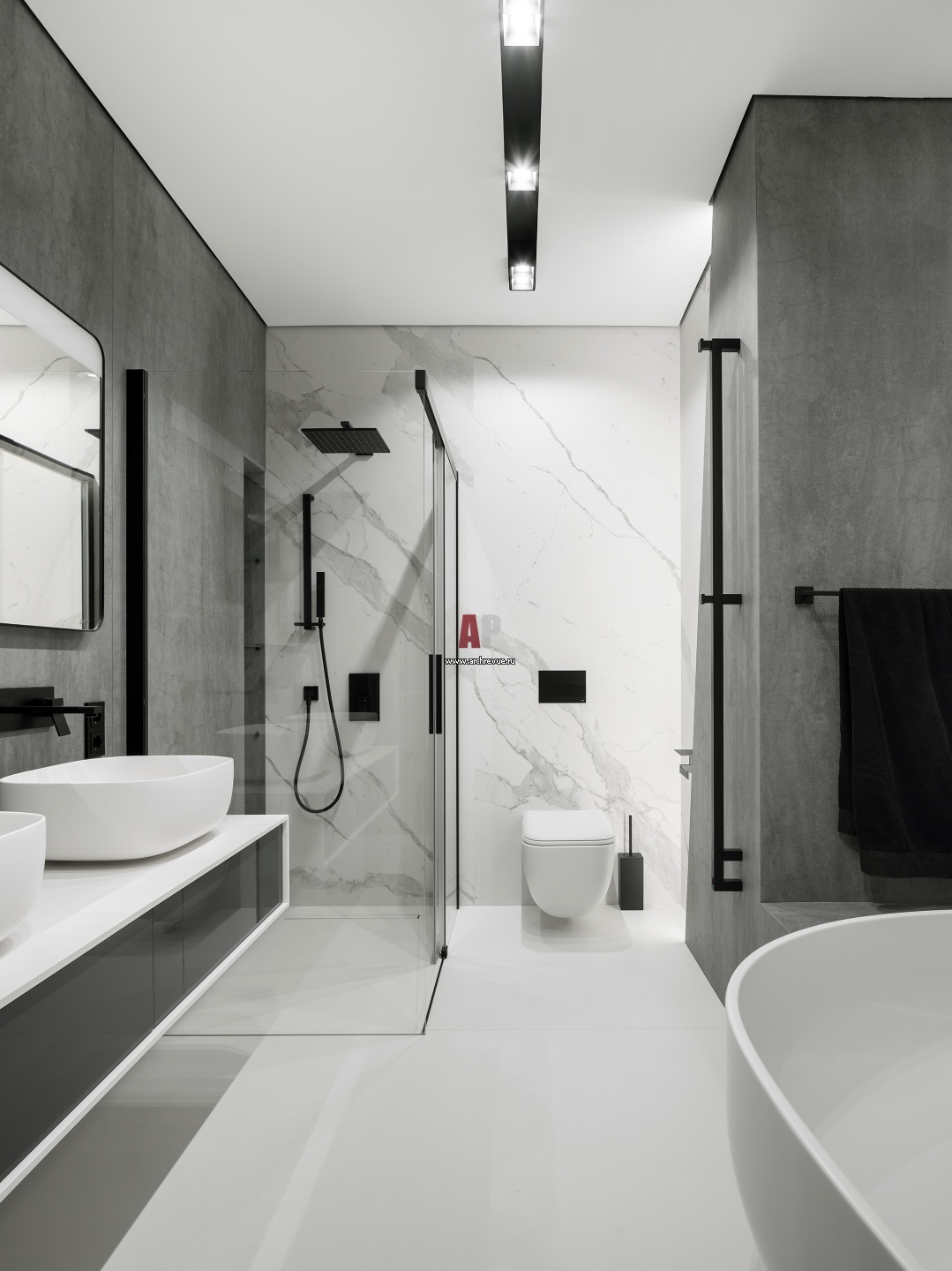 Монохромный хозяйский санузел имеет максимальный функционал. Парящая ванна, Glass 1989. Унитаз, Ceramica Cielo. Мебель, Antonio Lupi. Черные смесители, Gessi.