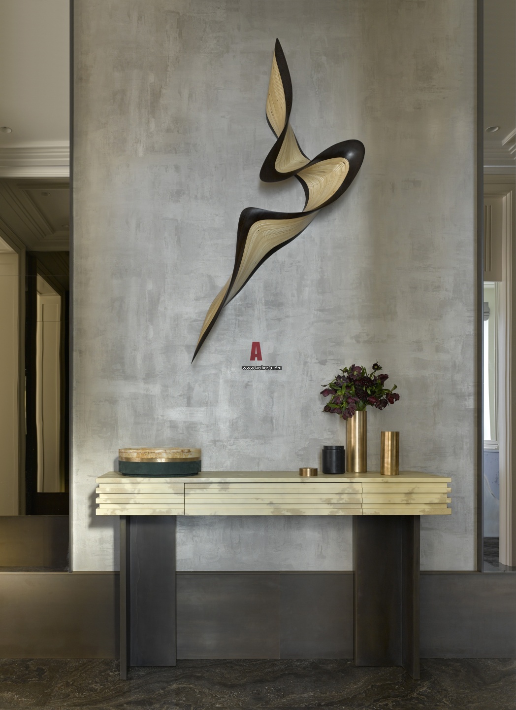 Интерьер прихожей в стиле ар-деко. Стена отделана финишем под бетон, на ней – арт-объект Kerry Vesper из дерева. Пол отделан мрамором Tobacco. Широкий плинтус выполнен из металла под бронзу.