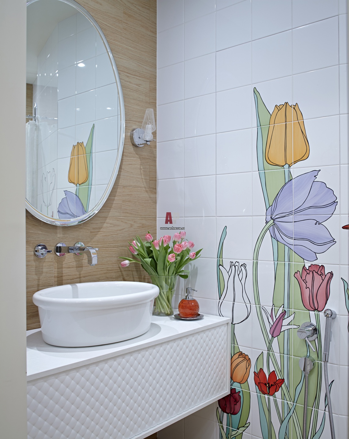 В интерьере гостевого санузла использовано несколько видов плитки. Стена за умывальником отделана плиткой под дерево. Основной объем облицован белой плиткой от Ceramica Bardelli с панно, изображающим тюльпаны. Сантехника, Villeroy & Boch.