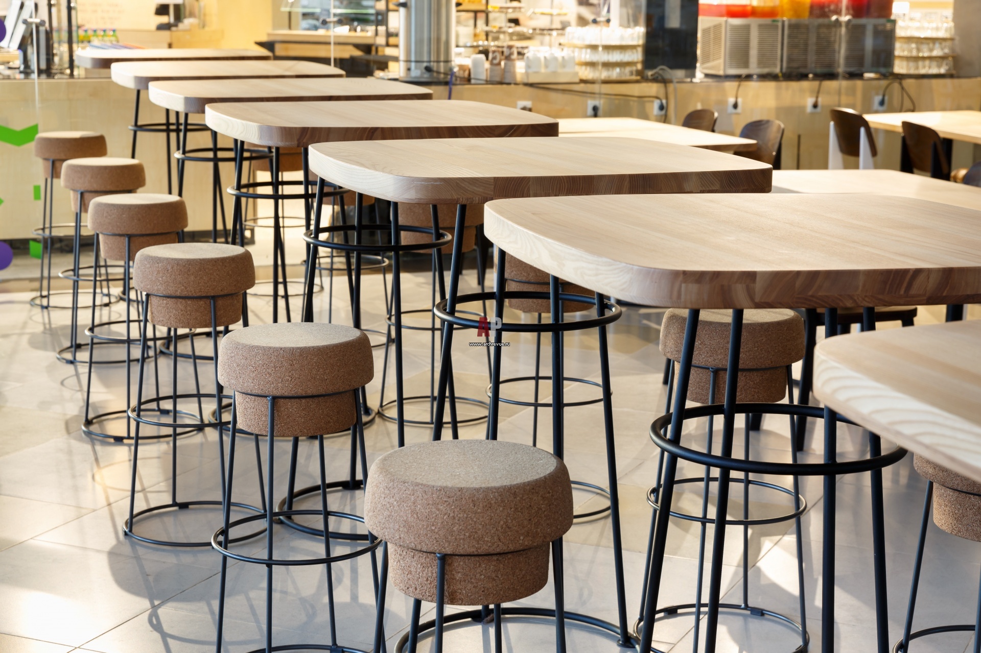 Сидения барных стульев сделаны из пробкового материала, их форма напоминает пробку от бутылки с шампанским.