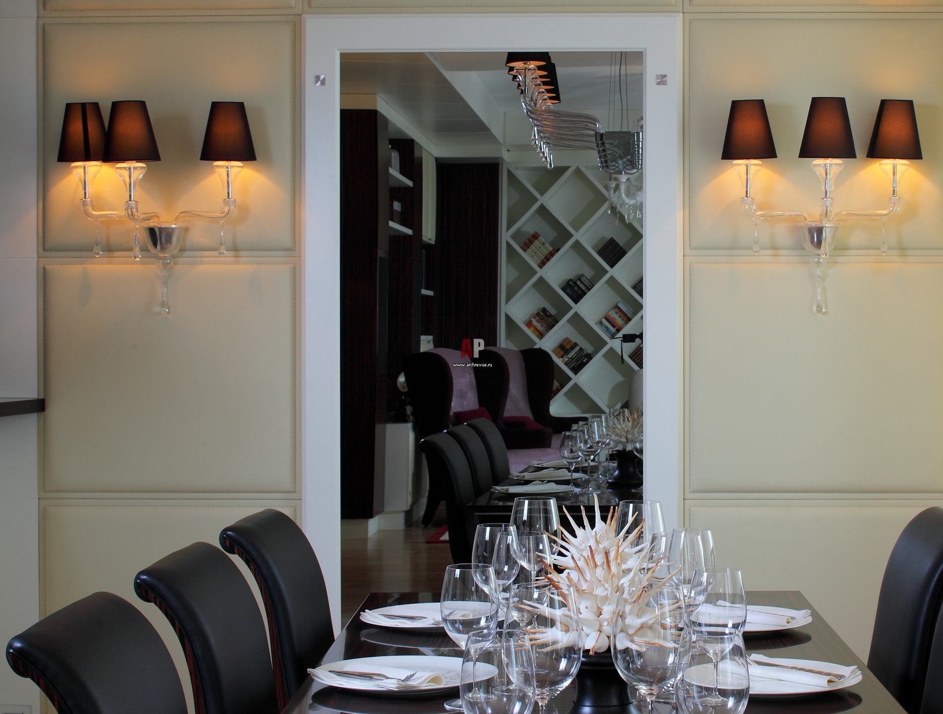 В зоне столовой стены облицованы кожаными панелями бежевого цвета. В большое зеркало встроен телевизор. Он становится виден, только когда его включают.