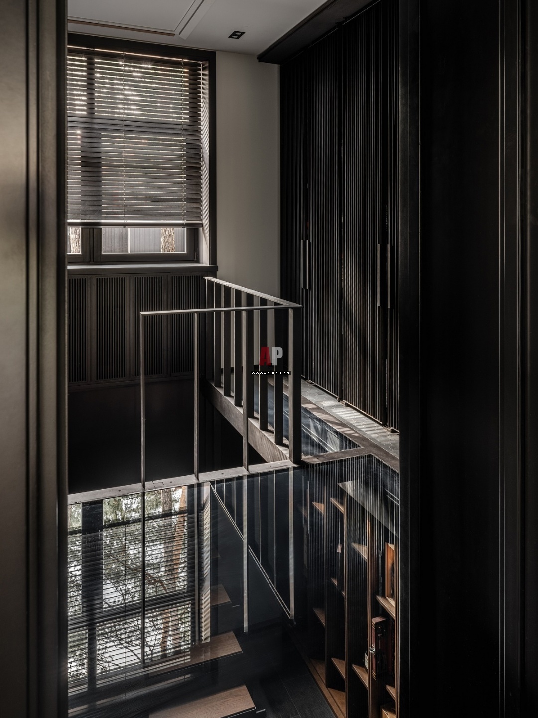Эклектичный особняк в Малаховке. Интерьер винотеки с лестницей и авторскими шкафами. Помещение оформлено в темной палитре.