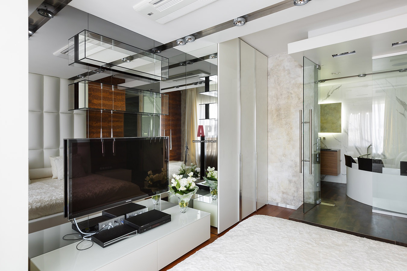 Интерьер белоснежной спальни. Зеркальные панели на стене за ТВ зрительно увеличивают пространство.