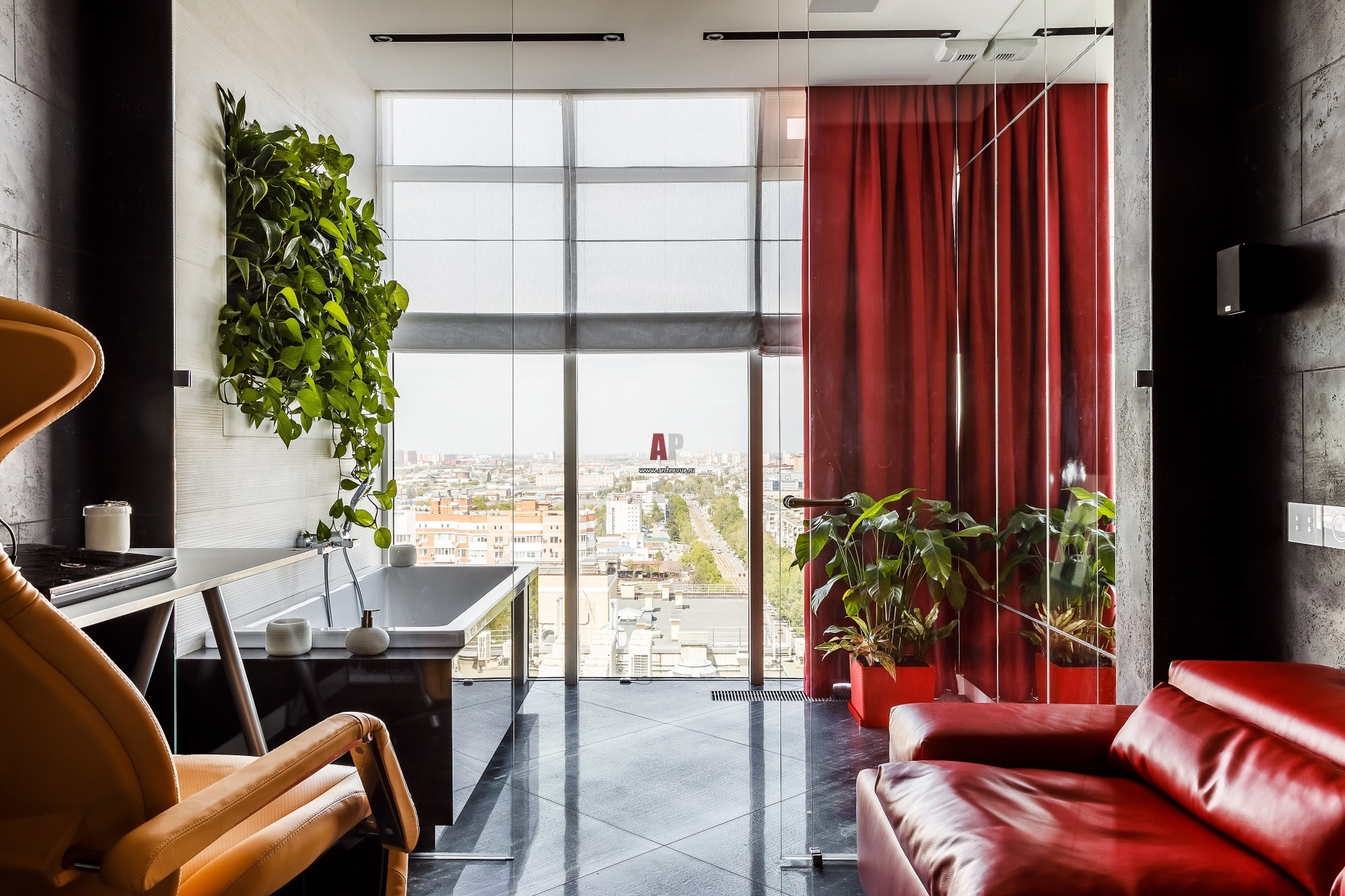 Дизайнеры воплотила давнюю мечту хозяина – панорамную ванную комнату, к которой примыкает кабинет. Красный кожаный диван, Swan. Стол изготовлен на заказ по эскизам авторов проекта. Ванна, Kaldewei. Стены и пол отделаны полуглянцевым керлитом.