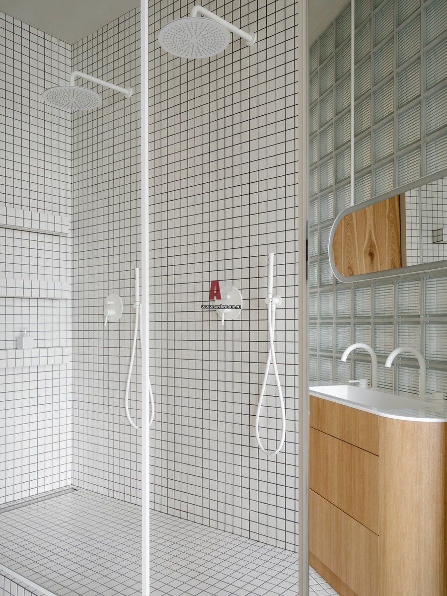 Хозяйский санузел. В зеркале отражается душевая, расположенная напротив умывальника. Помещение оформлено белой плиткой. Смесители и душевые лейки тоже белые. Душевая кабина, зеркало, тумба с раковиной, на заказ.