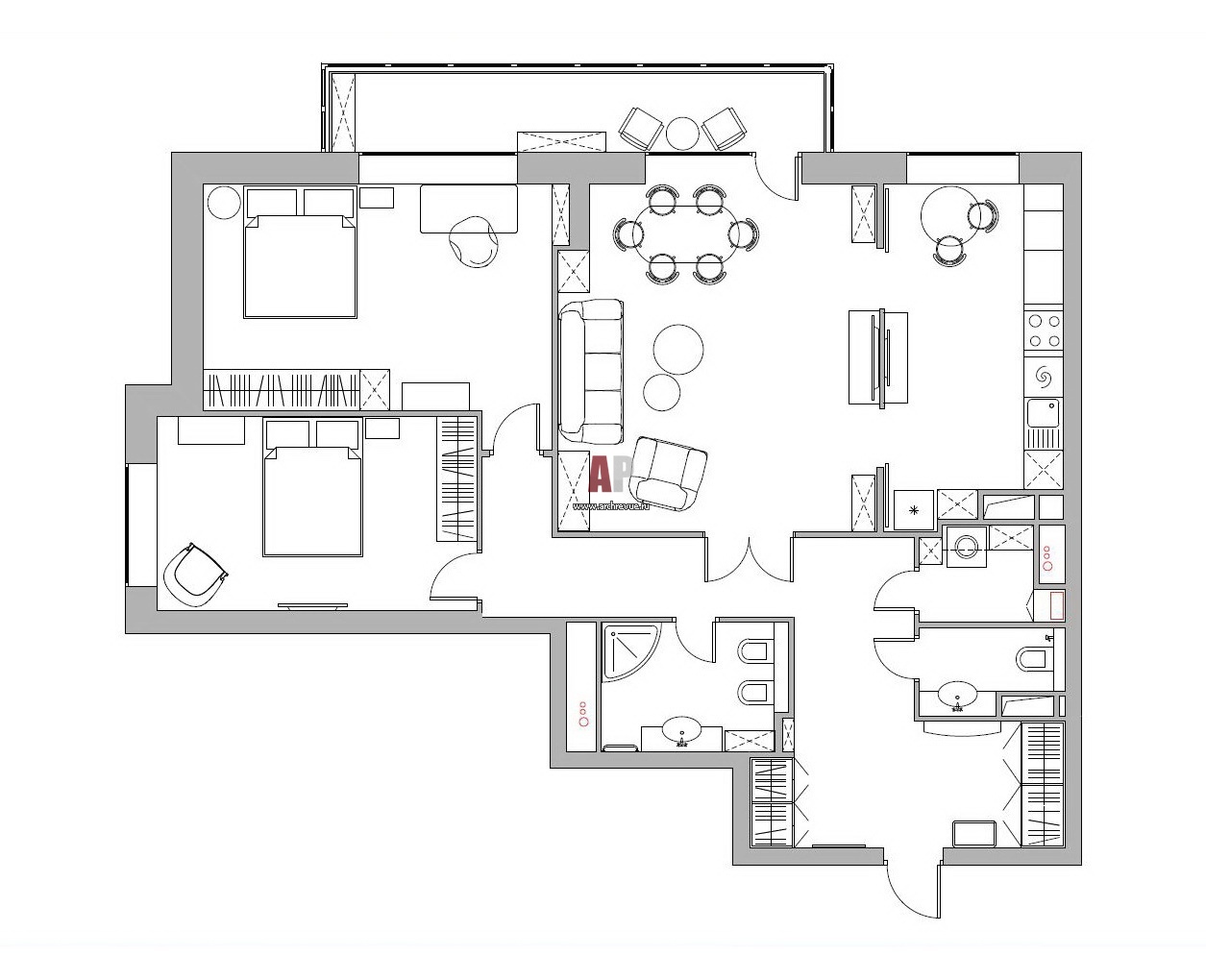 План трехкомнатой квартиры для пожилой пары. Общая площадь – 120 кв. м.