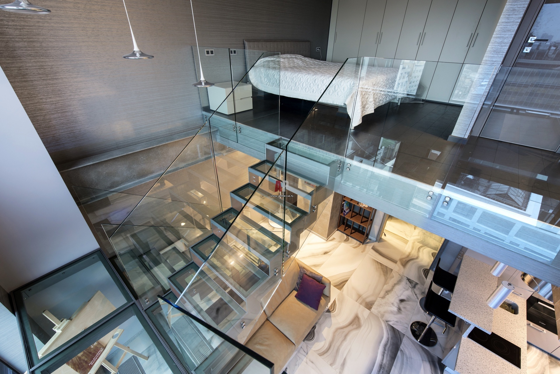 Лестница в стиле техно ведет на антресольный этаж. С центральной стеклянной площадки также можно подняться на внутренний балкон.