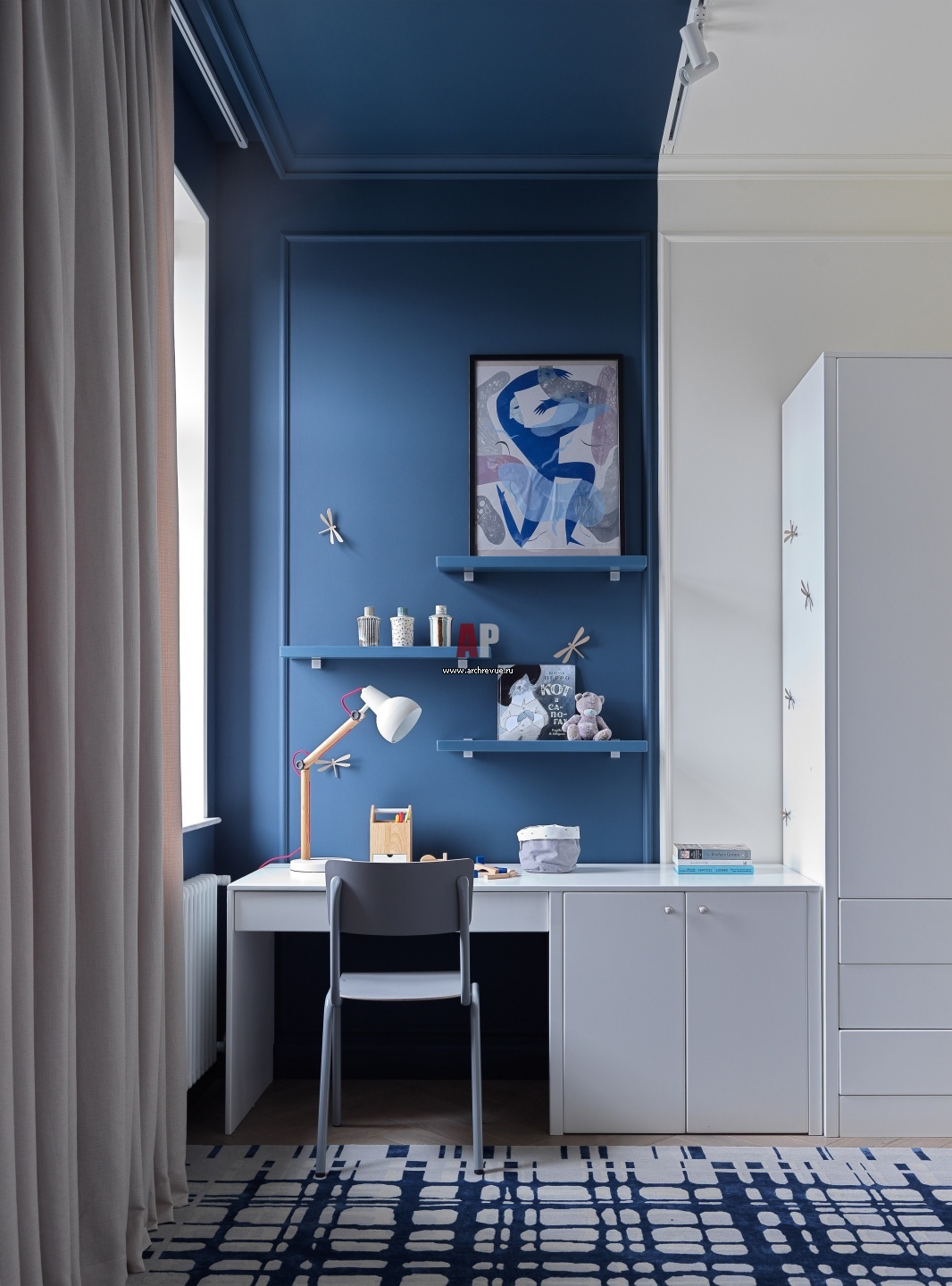 Интерьер одной из детских. Часть стены и потолка выкрашена в синий цвет, другая (в том числе и мебель) сделана белой. Мебель, DesingBoom. На полке – картина «В облаках2», художник Татьяна Лапонкина.