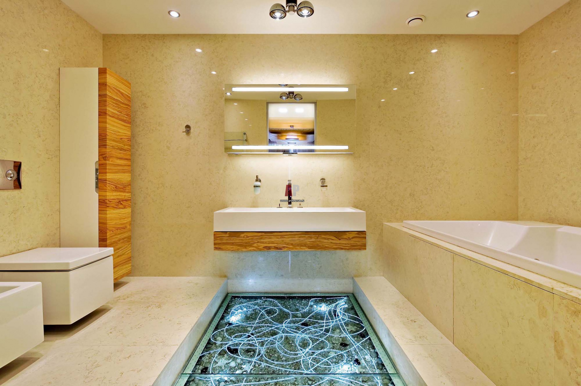 Фото интерьера современной ванной комнаты. Под стеклянным полом расположены светодиодные нити, они меняют свой цвет.
