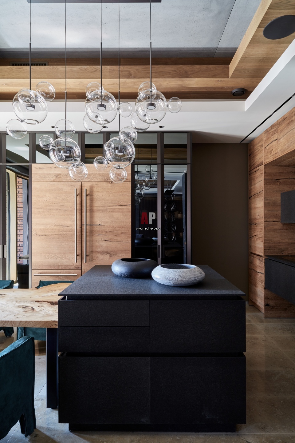 Интерьер кухни в эко-стиле. Кухонный остров, Eggersmann, из гранита, поверхность которого обработана травлением. Встроенный блок холодильника и винный шкаф, Eggersmann. Композиция из стеклянных витрин в металлическом корпусе, Poliform. Потолочные светильники-шары, Giopato & Coombes.