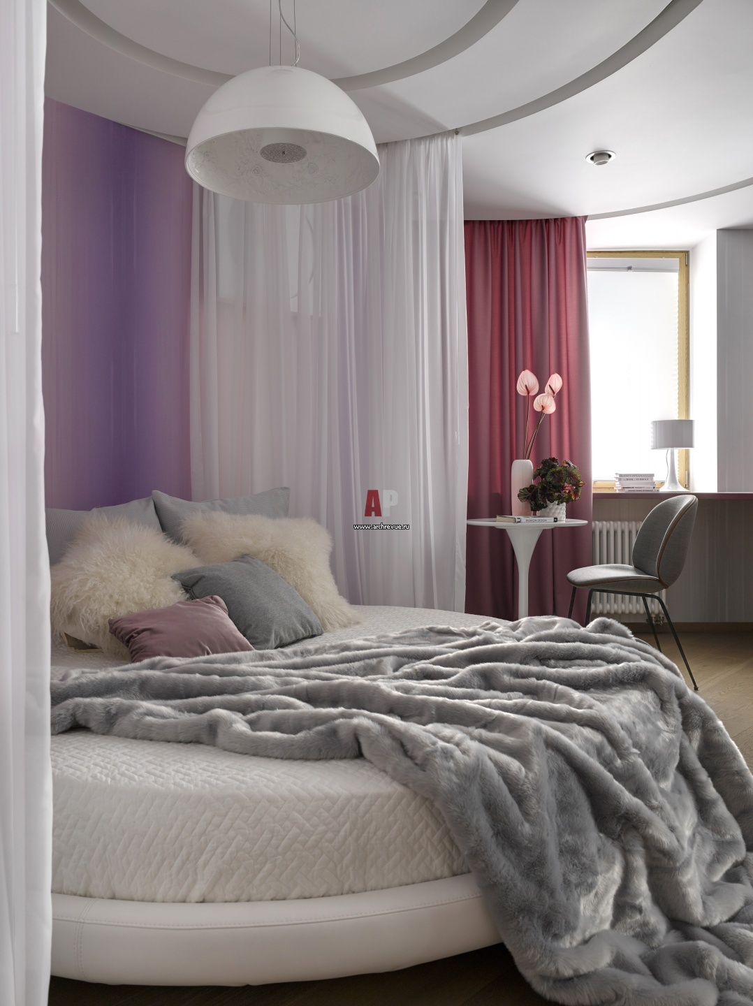 Детская комната дочери с круглой кроватью решена в насыщенных розово-лиловых цветах. Обои, Elitis. Стул, Gubi.