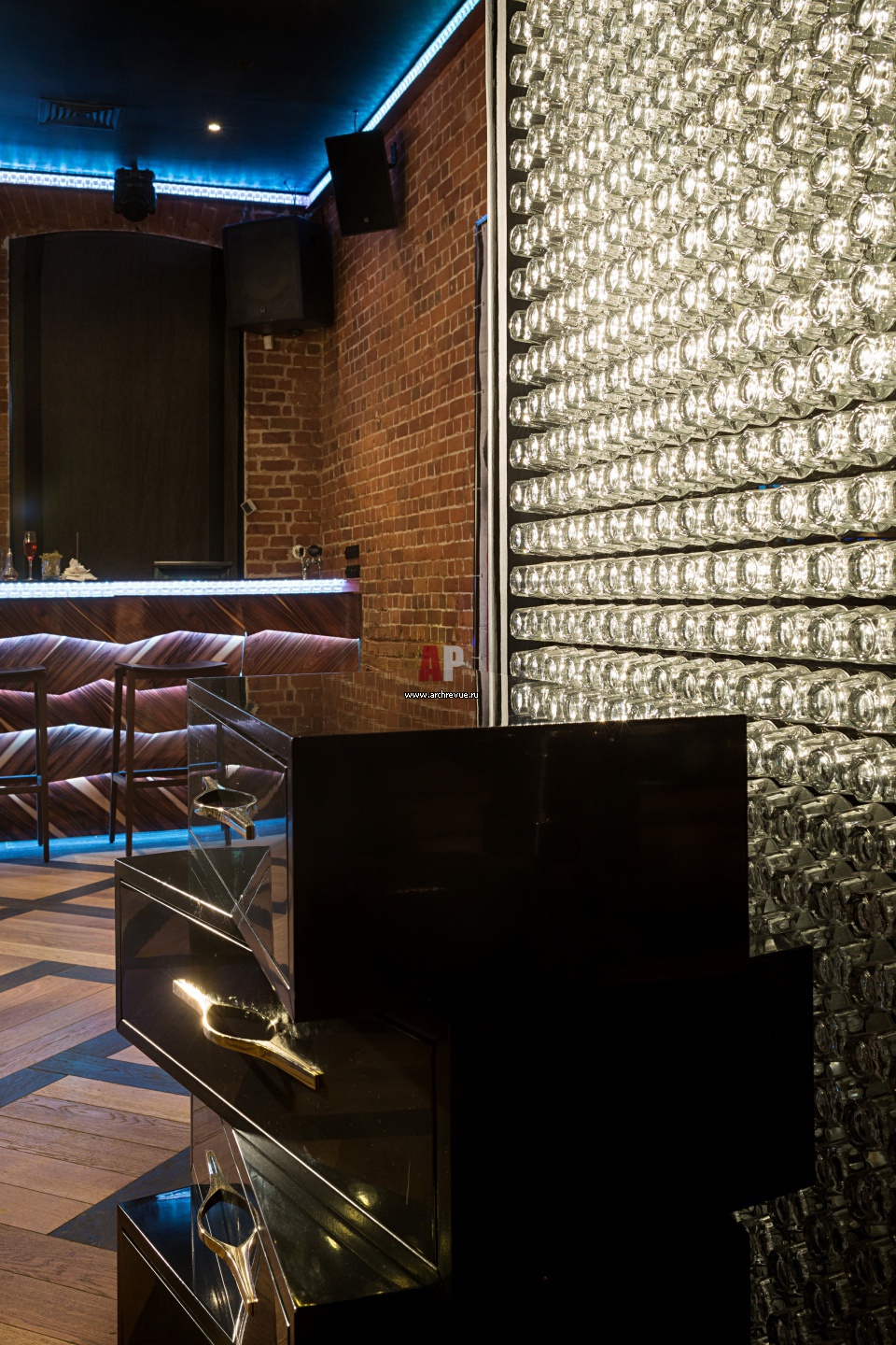 Портал из водочных стопок сделан на заказ, по эскизам MEGRE INTERIORS.