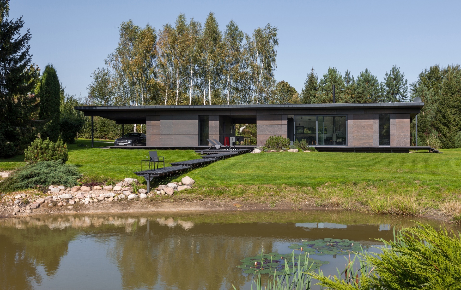 Основная идея дома — взаимопроникновение архитектуры и ландшафта. Вдоль главного и противоположного тылового фасада имеются монорельсы, по которым двигаются створки-ставни: при необходимости они перекрывают центральный открытый дворик и таким образом соединяют дом в один непрерывный объем. Они же используются как солнцезащитные устройства.