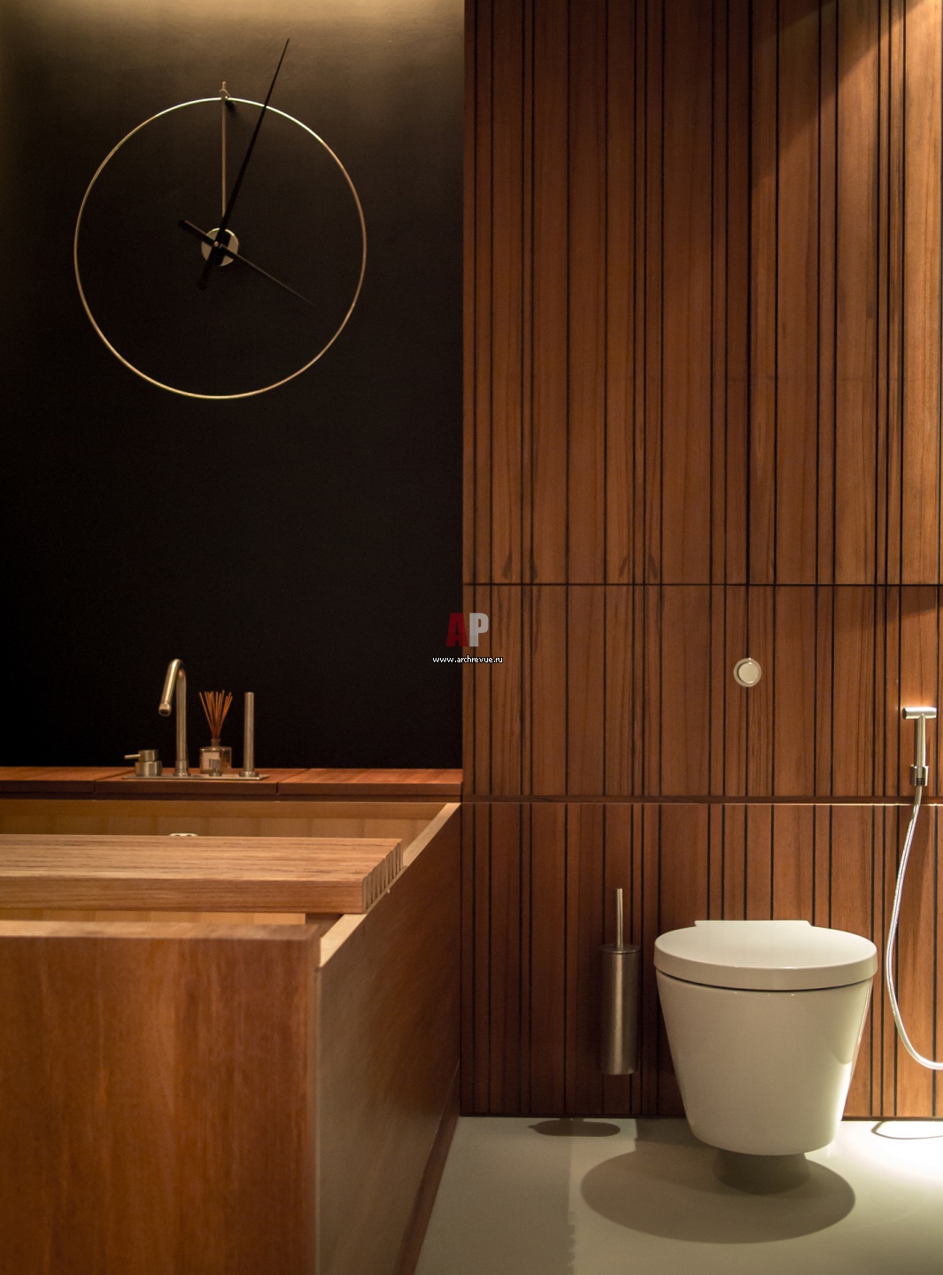 Стиль минимализм в интерьере санузла. Деревянные панели на стенах. Сантехника по дизайну Филиппа Старка для фабрики Duravit.