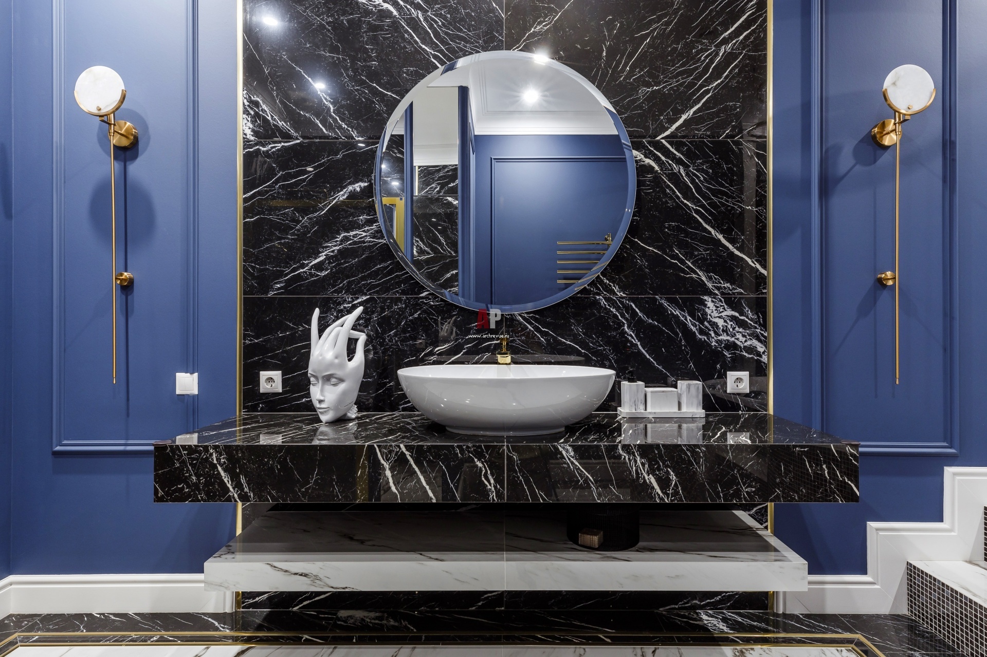 Зона умывальника в хозяйской ванной комнате акцентирована насыщенным кобальтовым цветом. Столешница изготовлена из черного мрамора.