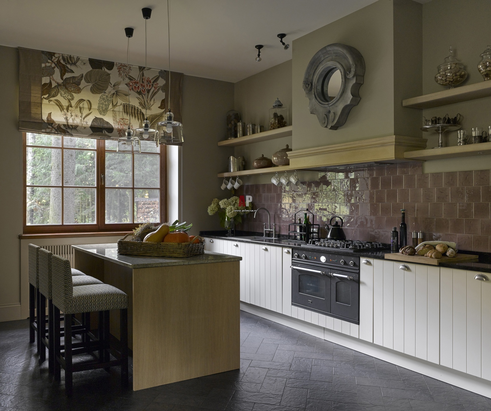 Кухня и столовая – помещения смежные. Кухонный фартук отделан глазурованной керамической марокканской плиткой. Кухня, Rot Punkt. Столешница кухонного острова из натурального гранита. Светильники, Fancy Home Collection. Барные стулья, Marie's Corner.