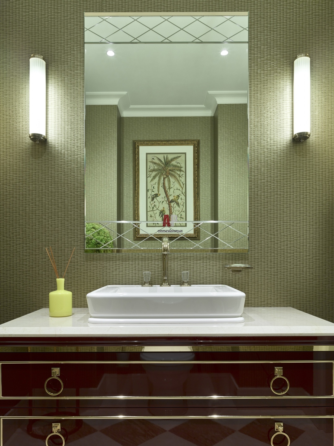 Гостевой санузел в фисташковых тонах. Умывальник, Oasis. Накладная раковина, Villeroy & Boch. Смеситель, Dornbracht.