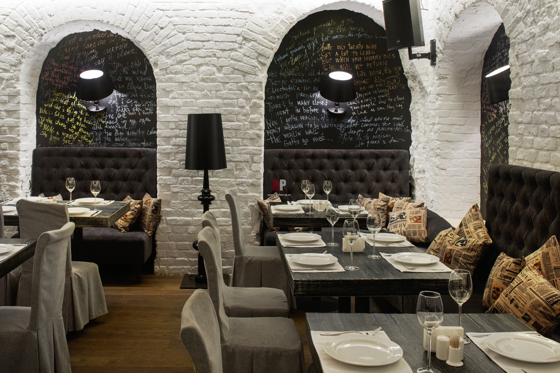 Интерьер вечернего зала, расположенного на нижнем этаже. Темно-шоколадные диваны размещены в арочных нишах.