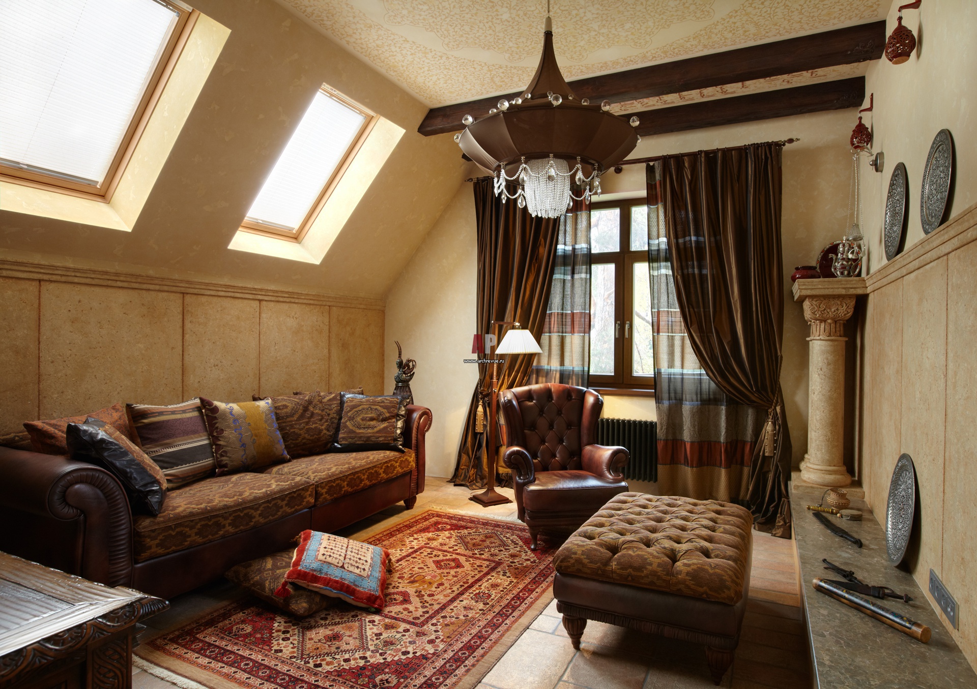 Марокканская комната украшена расписанными вручную арабской вязью потолками и колоннами из оселкового мрамора на подиуме. Диваны и кресла из коричневой кожи Mantellassi, поставщик «ТРИО-Интерьер». Ковры, разноцветные подушки, чеканные тарелки, люстра-чалма украшают яркий этнический интерьер.