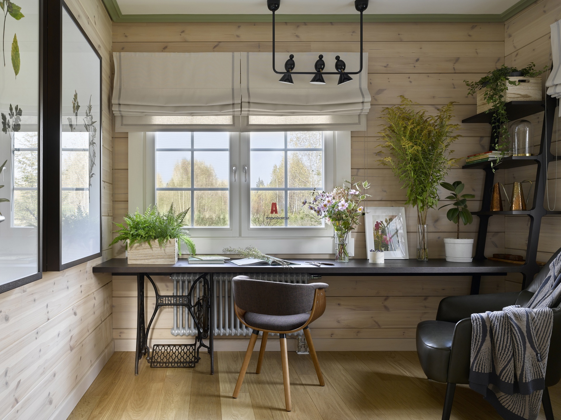 Кабинет-мастерская хозяйки на первом этаже. Стол с подножьем из основания швейной машинки ZINGER сделан на заказ. «Эта машинка – старинная, она дорога хозяйке как память, но была в плохом состоянии. Мы ее отшлифовали, покрыли лаком, сверху спроектировали деревянную столешницу, а сбоку добавили полки с такими же плавными соединениями, как и везде на мебели», - рассказывает дизайнер Марина Пенние.