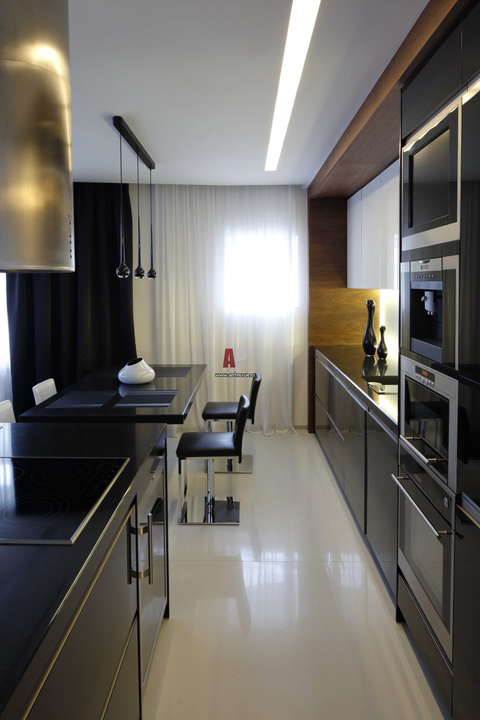 Завершенность интерьеру придает натуральное дерево: оно присутствует почти во всех помещениях. В зоне кухни панелями из ореха облицована одна из стен.