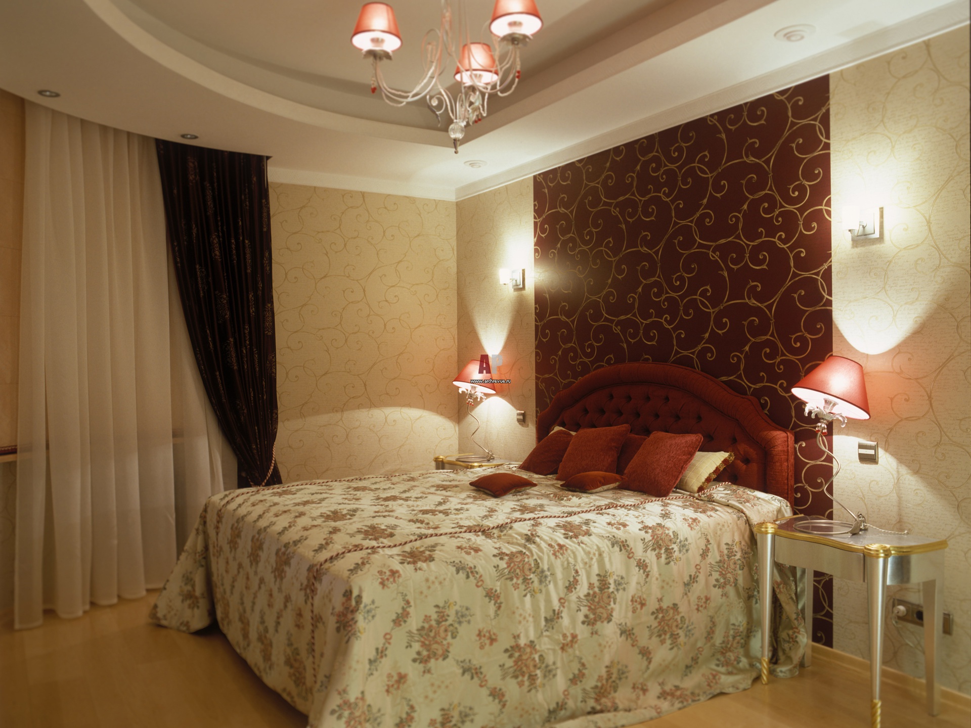 Пространство спальни решено с помощью контрастных цветовых решений. Зона кровати, спальня Colombostile, подчеркнута декоративным панно. Особого внимания заслуживает освещение прикроватной зоны. Кроме настольных ламп Baga авторы используют настенную подсветку, позволяющую комфортно читать.