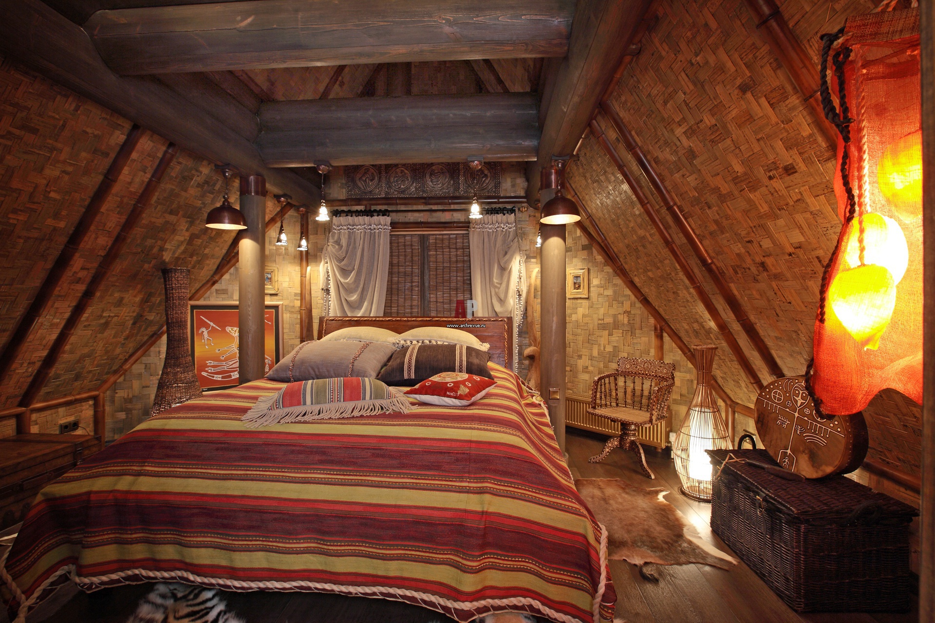 На фото – восточная гостевая комната. Деревянные потолочные балки были затонированы и промаслены, теперь они выглядят брутально. Раскладка на стенах выполнена из стеблей бамбука.
