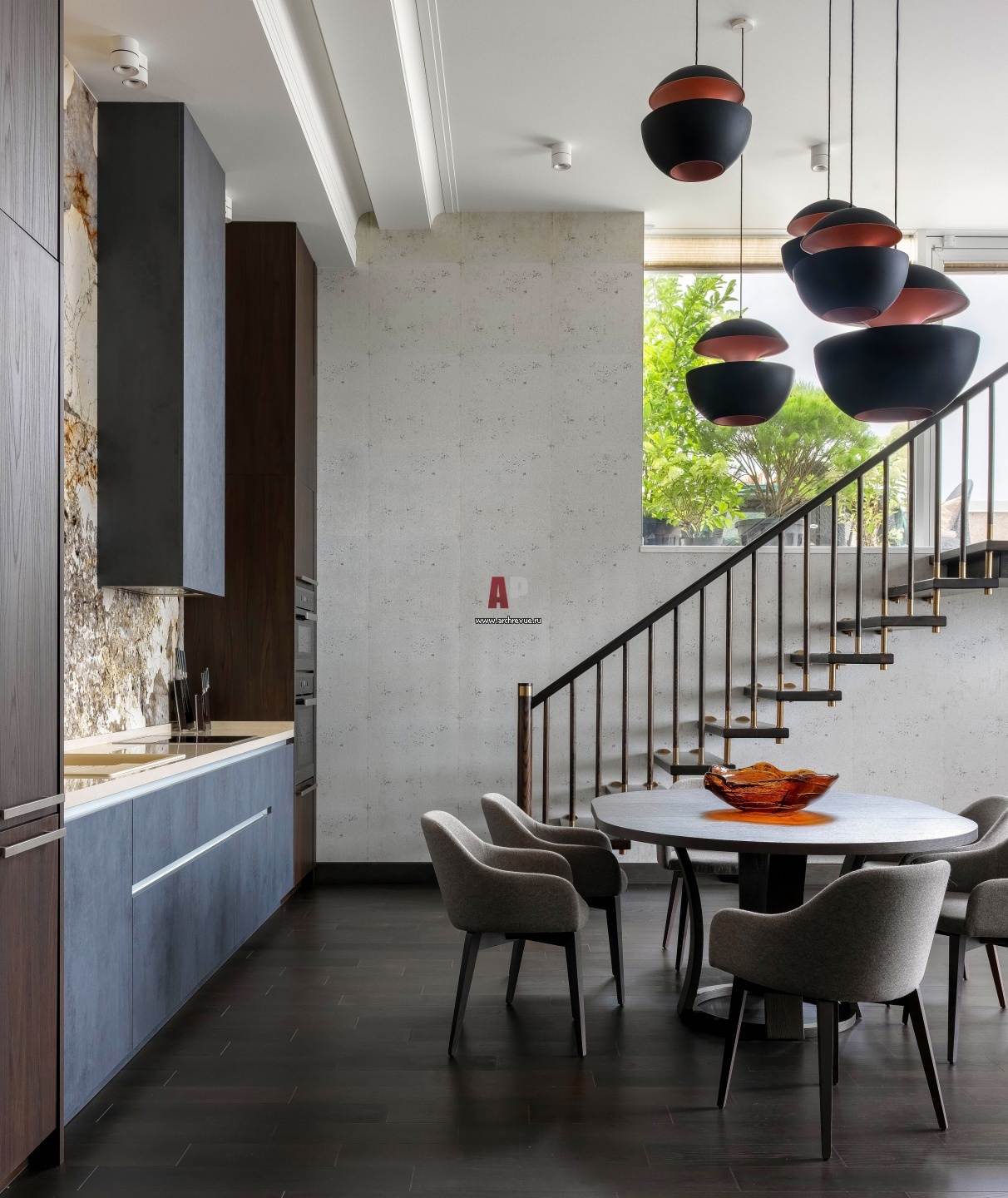 Интерьер пентхауса с четырехметровыми потолками и с выходом на террасу, расположенную на верхнем уровне. Обои с природной текстурой, Eijffinger, коллекция Resource.