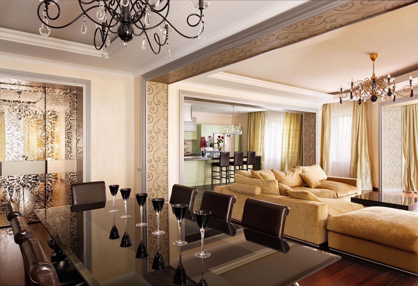 Столовая решена в едином пространстве с гостиной. Декоративности интерьеру добавляют стеклянные панели и перегородки Longhi с растительным орнаментом, нанесенным пескоструйным методом.