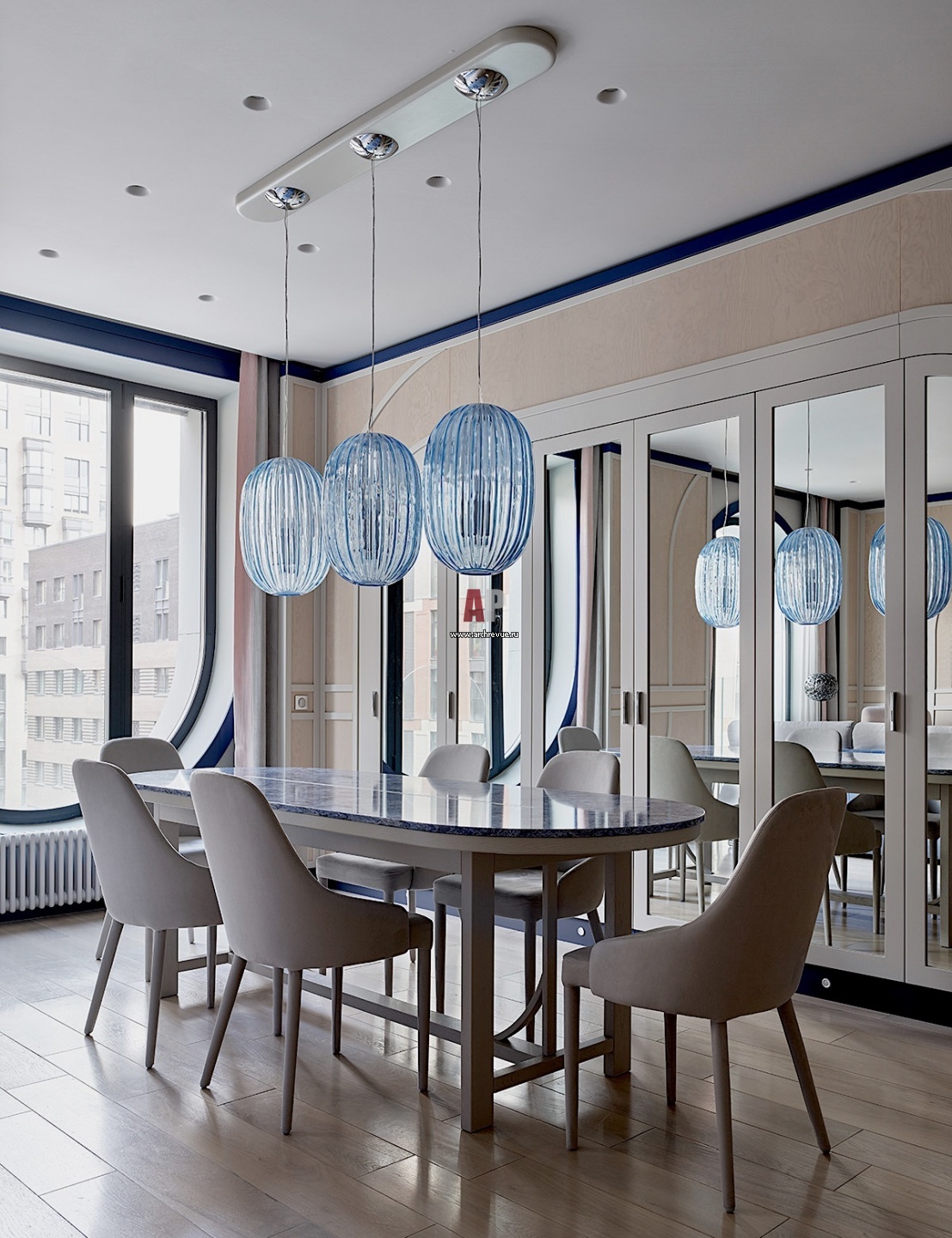 Обеденный стол сделан на заказ. В столешницу из красивого камня вмонтированная светодиодная нить, она подсвечивает сервировочные блюда, придавая им сходство с артом. Стол со спецэффектами задумывался на этапе черновой отделки, под него в полу была выведена электропроводка.