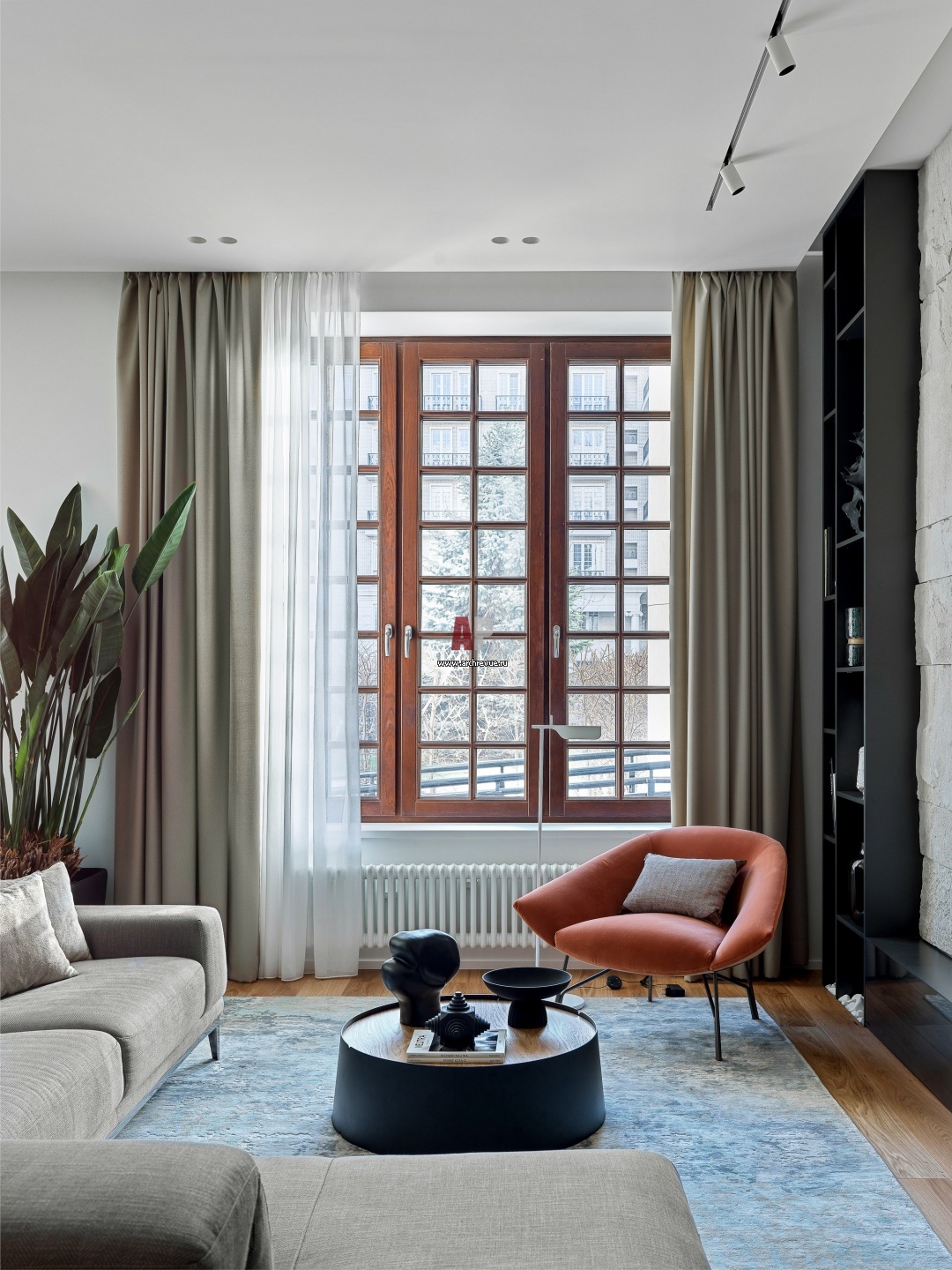 Особенность дома – увеличенные окна и рамы с тонким перелетом. Декорированные деревом они создают настроение загородного дома. Акцентное кресло, Lema, модель Lennox.
