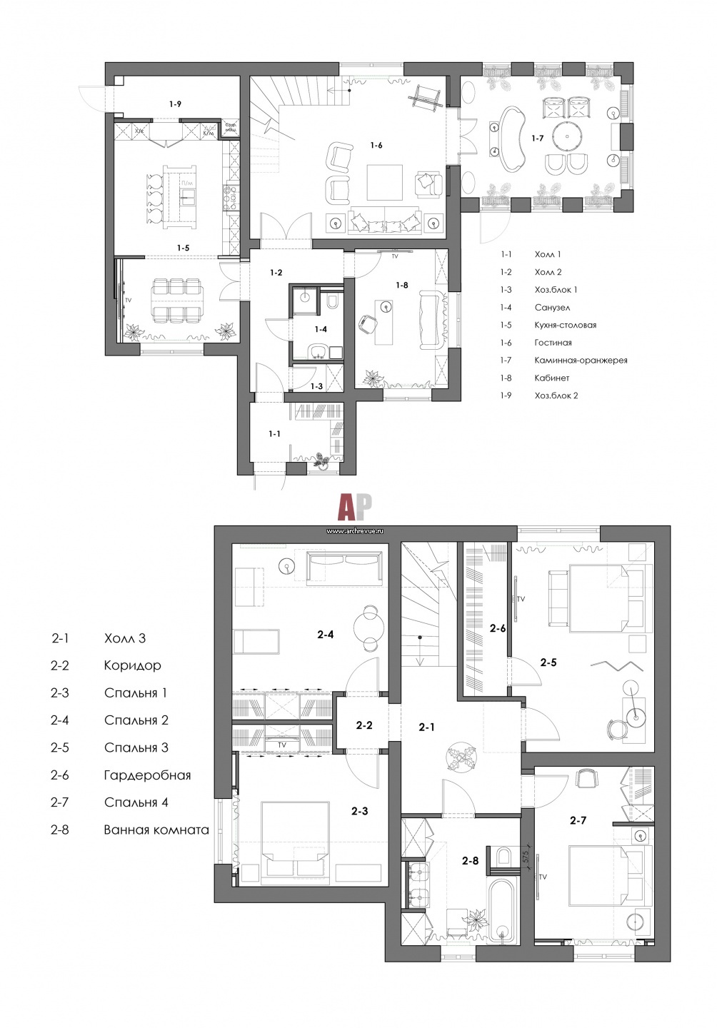 Планировка 1 и 2 этажей 2-х этажного дома в классическом стиле.