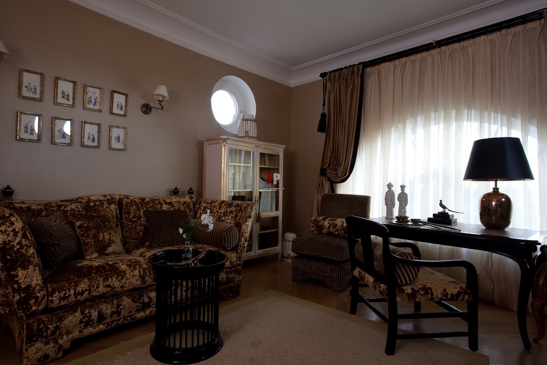 Гостевая комната декорирована в китайском стиле. Диван, кресла Duresta. Столик Lambert. Витрина Salda. Ковер Bomat.