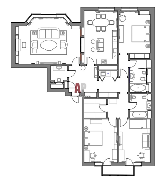 План 4-х комнатной квартиры для семьи с двумя детьми в ЖК «Четыре Солнца». Общая площадь – 190 кв. м.