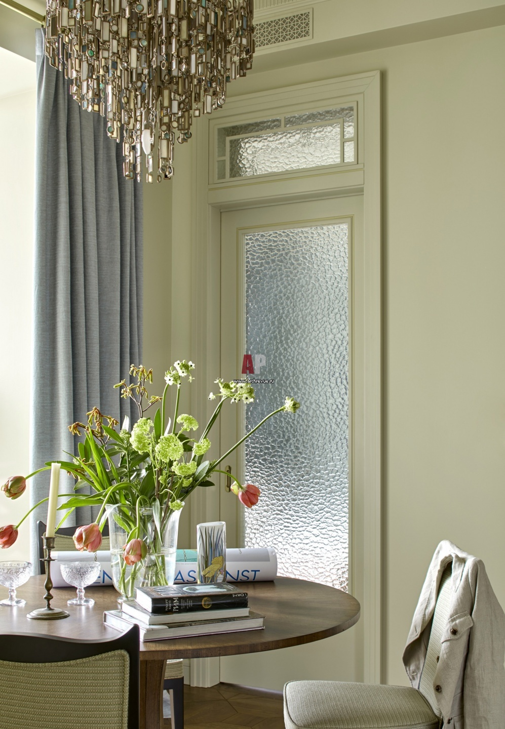 Элегантный интерьер столовой. Витражная дверь кассетного типа сделана на заказ.