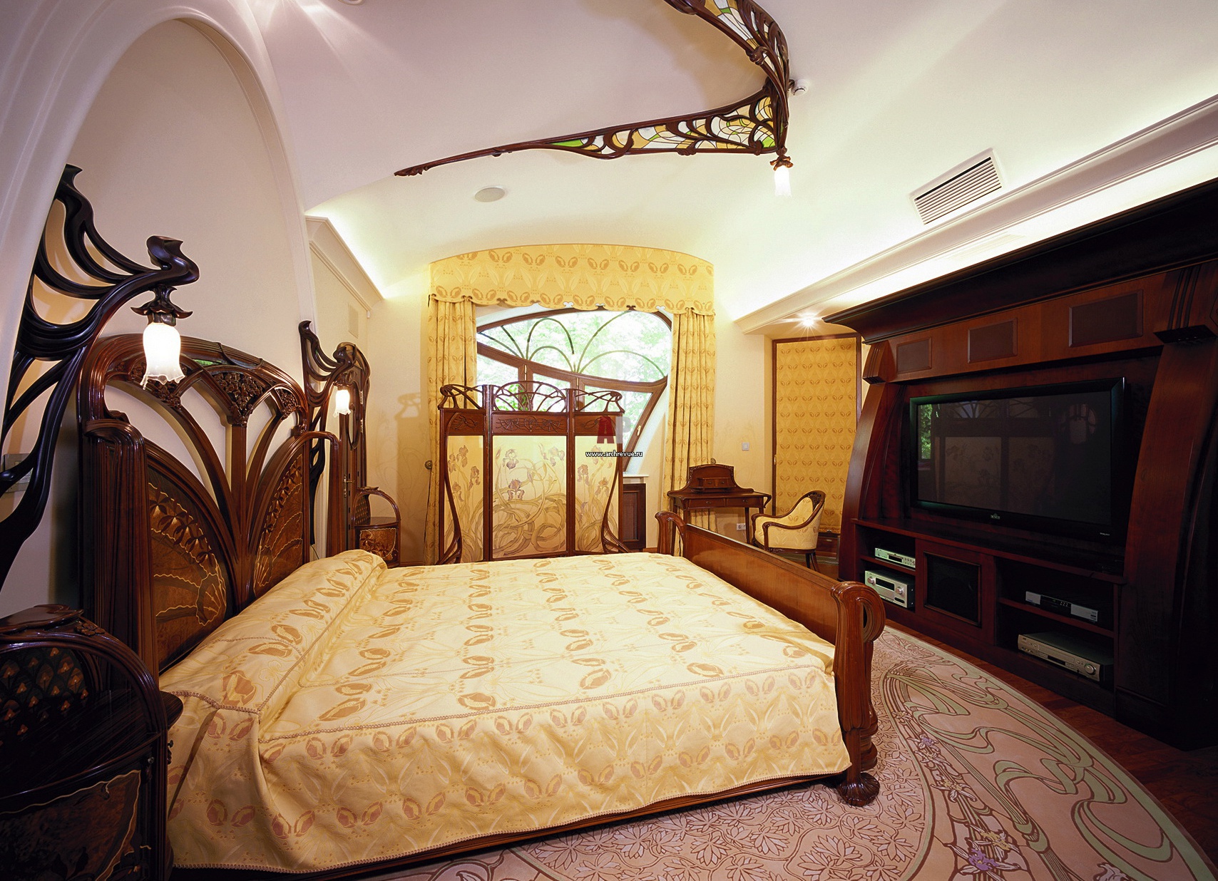 Фрагмент интерьера главной спальни. Как и в других комнатах, при оформлении потолка в спальне хозяев использован мотив подковы. Деревянная композиция декорирована витражными вставками, изготовление «Мастерская Александра Феряева».