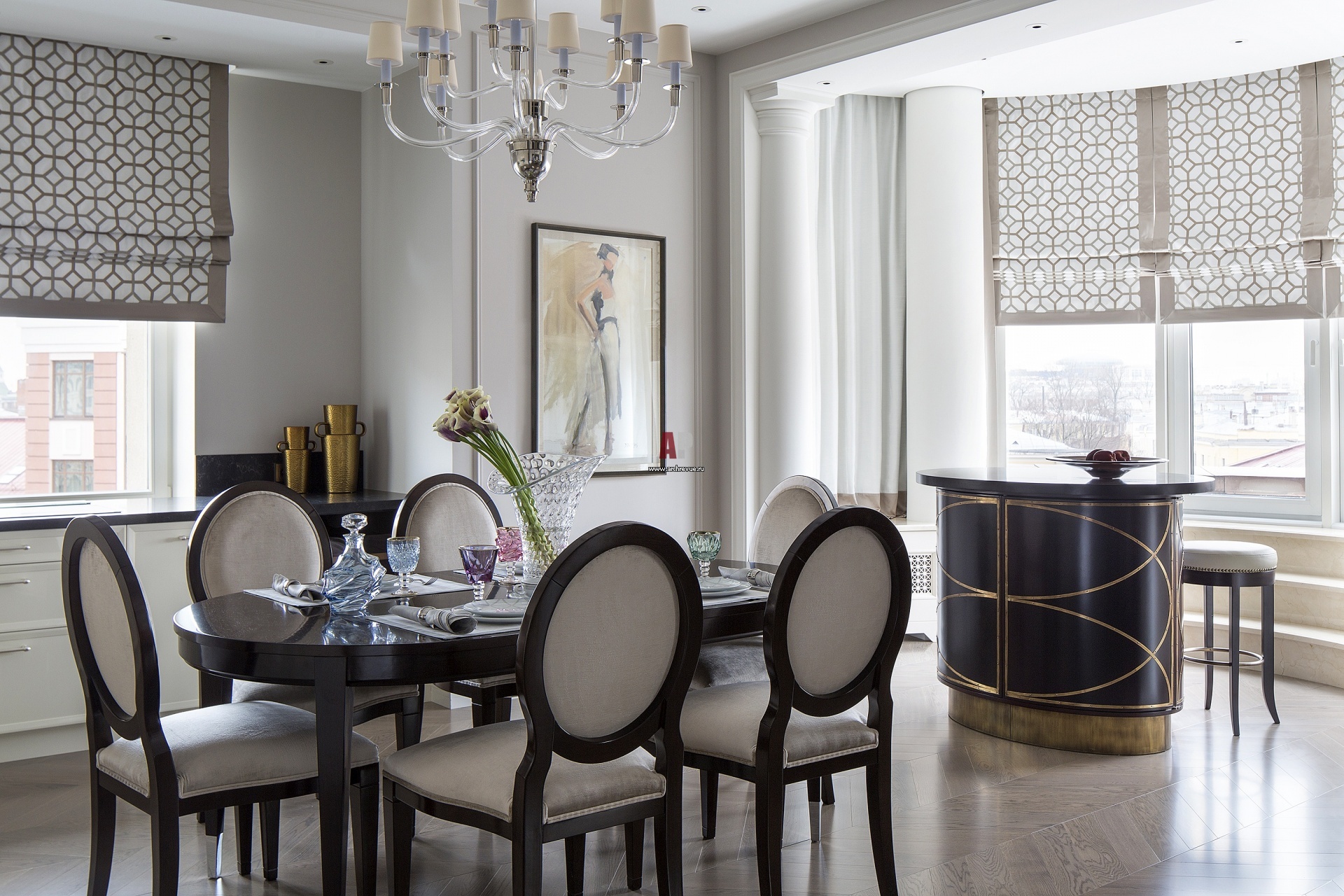 Столовая группа с барной зоной в эркере. Обеденный стол, стулья Opera Contemporary. Остров-бар овальной формы с радиусными дверцами и отделкой из латуни (декоративные накладки, цоколь, оформление столешницы) выполнен в стилистике ар-деко по эскизам автора проекта.